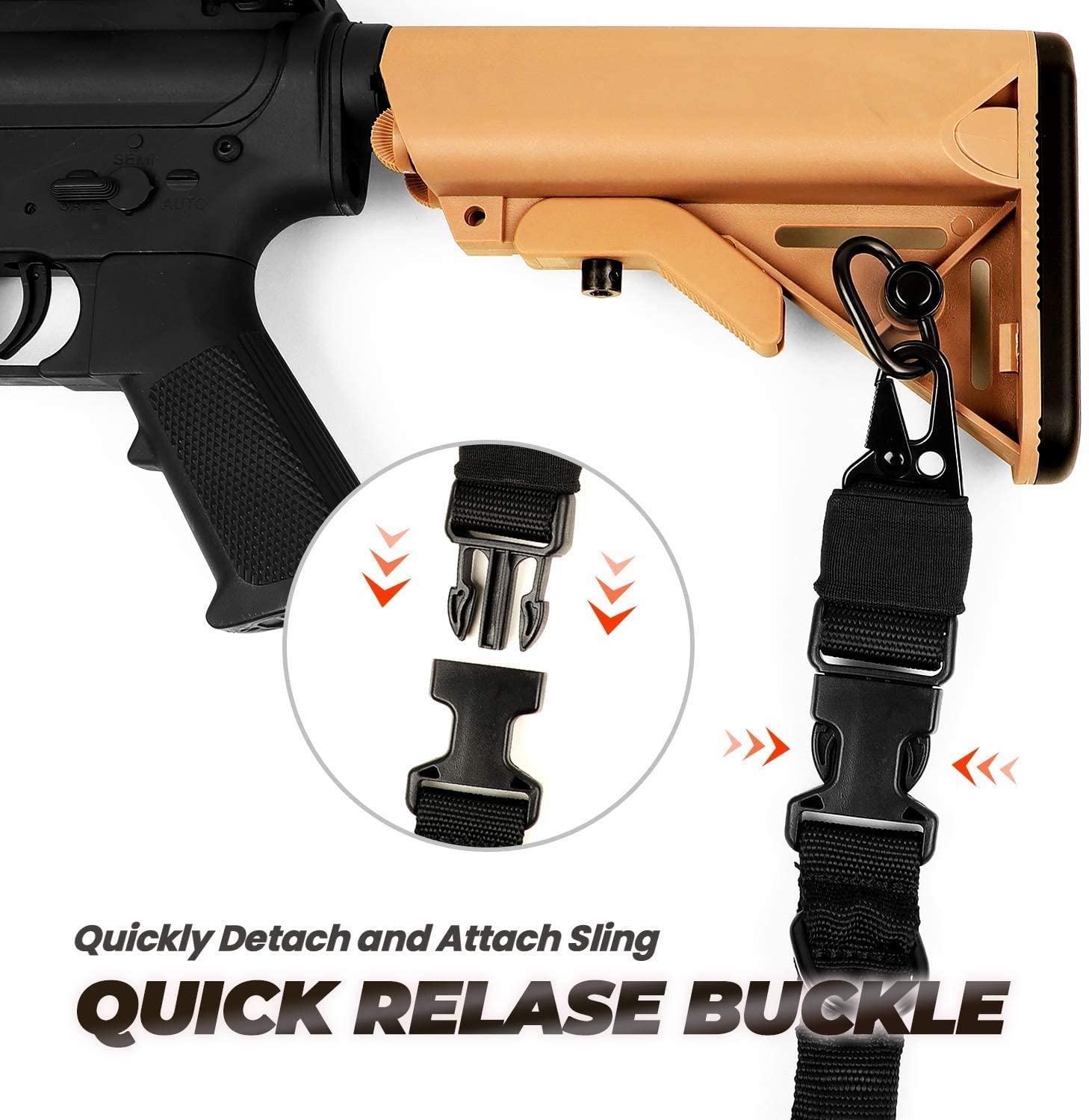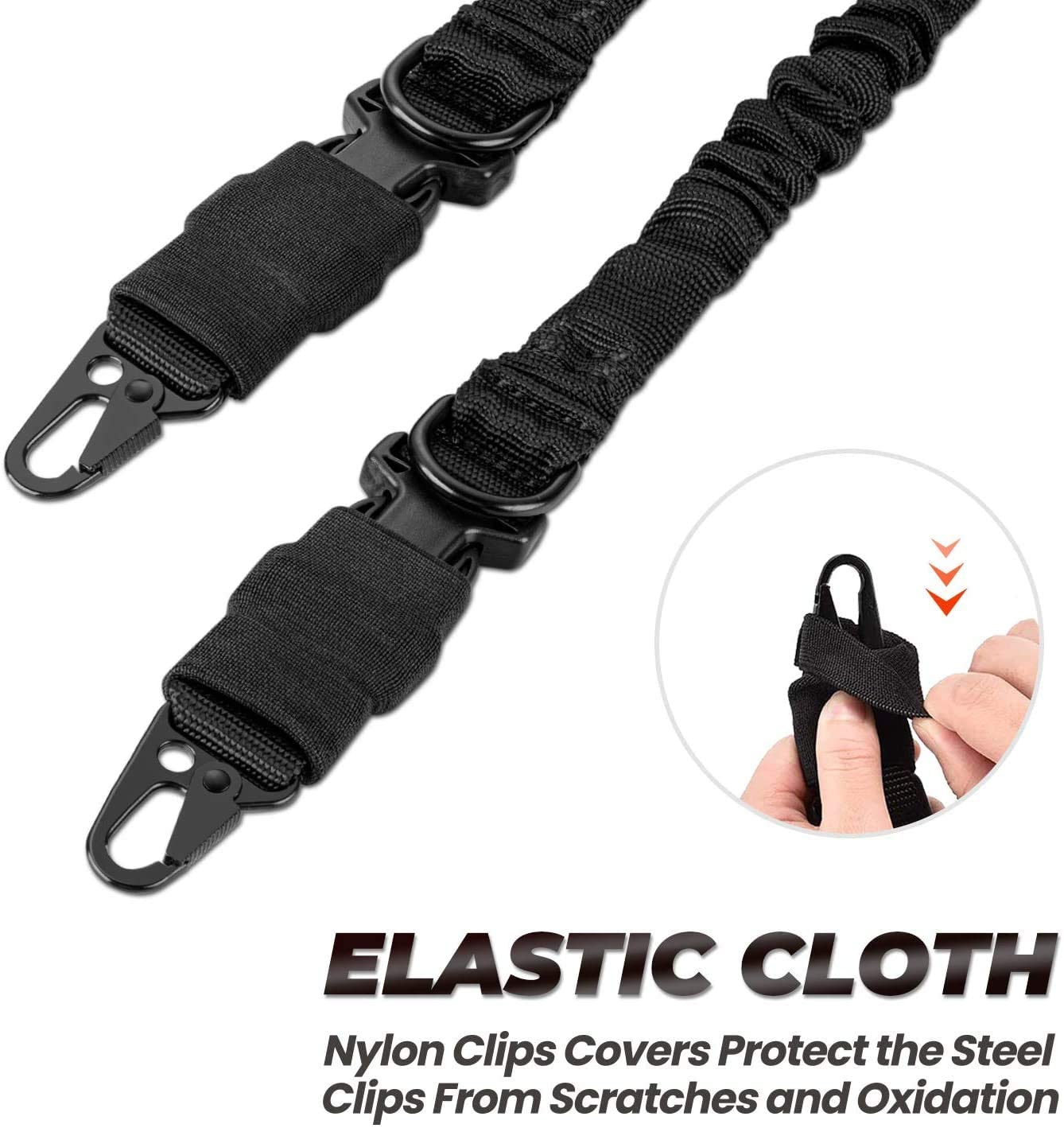 - 【SOLID & DURABLE】 Two point rifle sling made from a high density nylon material which provides a long lifetime of the product. Heavy duty nylon construction ensures both enhanced durability and all-weather traction and the gun sling release buckle designs allow you take down the gun easily and multi-use metal D rings for carrying.